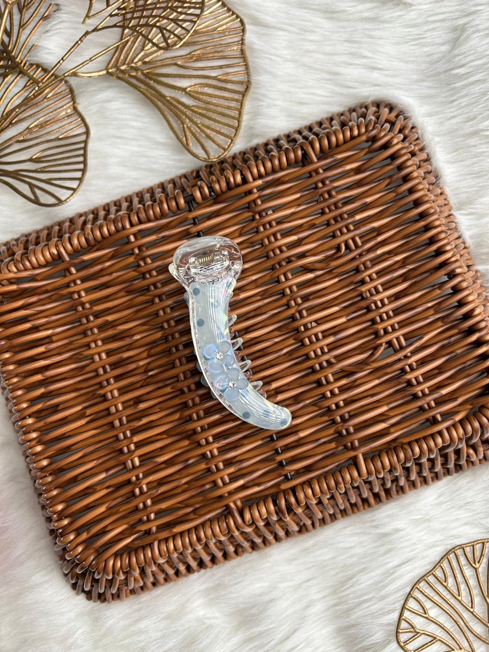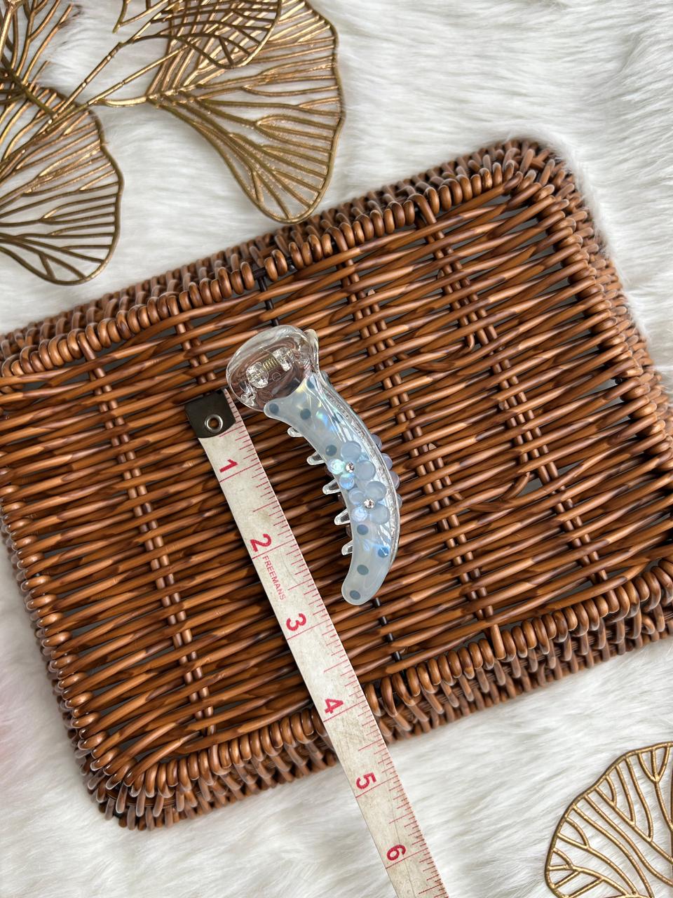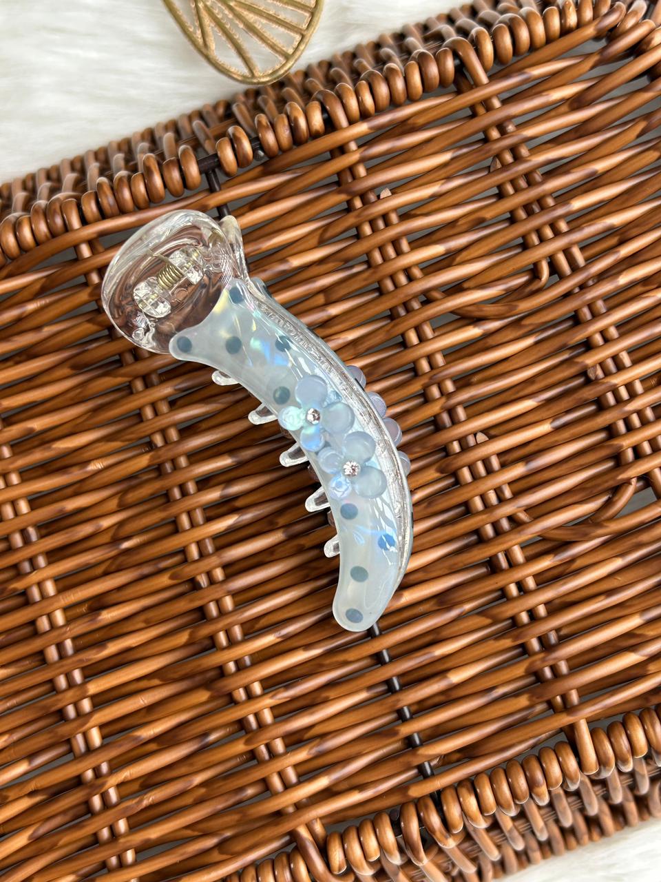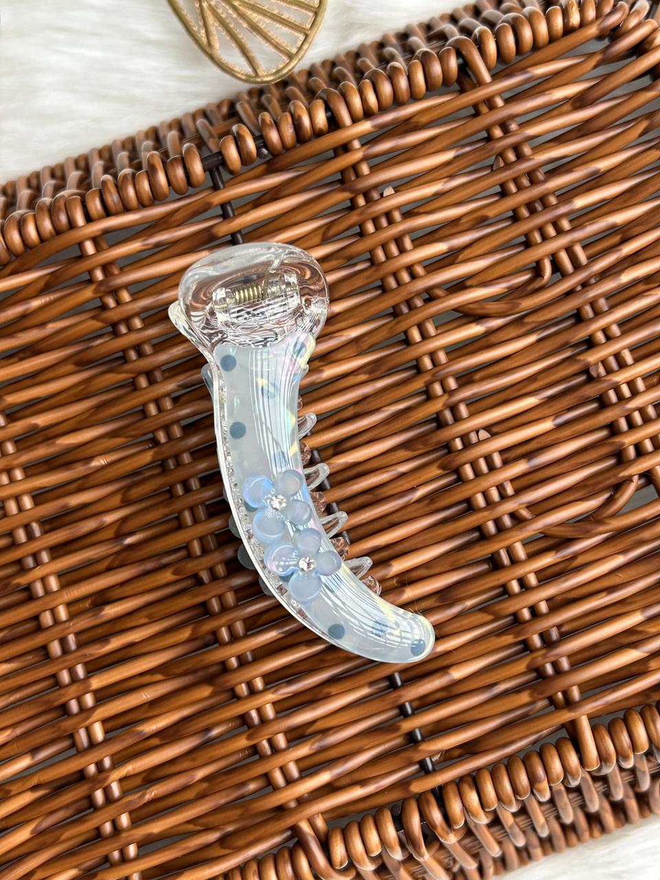Add a touch of refined charm to your hairstyle with this elegant banana hair clip. Crafted in a soft translucent finish with subtle iridescent polka details, this clip is beautifully adorned with delicate floral accents and crystal centers for a graceful, feminine look.