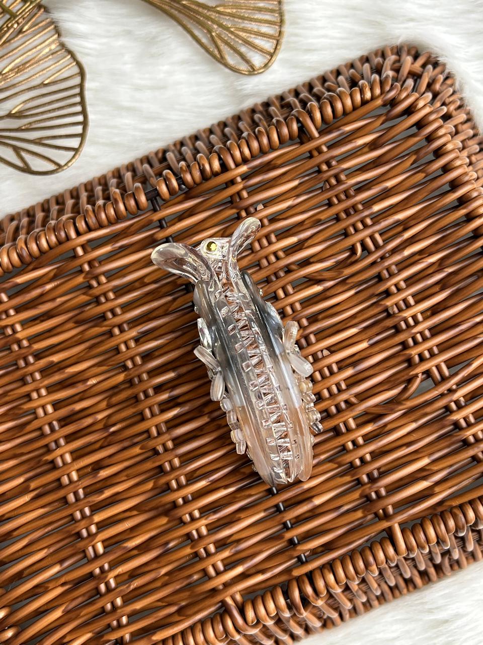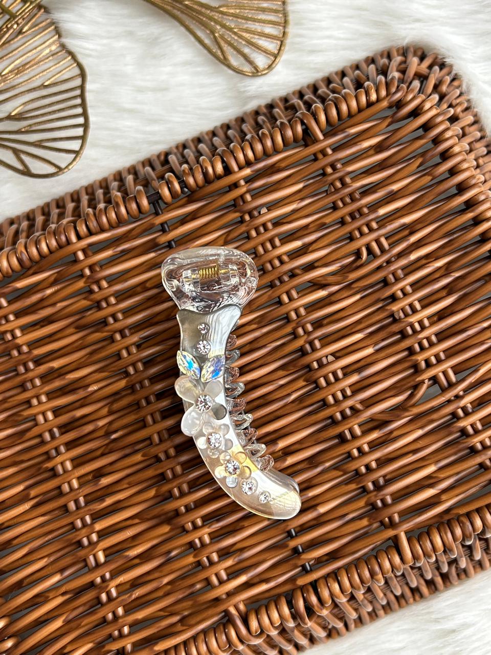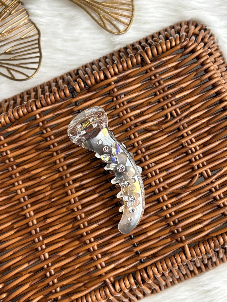Add a touch of refined charm to your hairstyle with this elegant banana hair clip. Crafted in a soft translucent finish with subtle iridescent polka details, this clip is beautifully adorned with delicate floral accents and crystal centers for a graceful, feminine look.