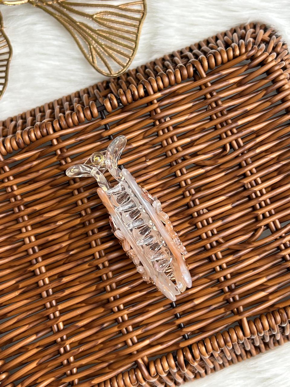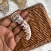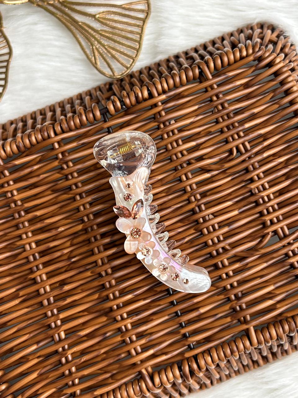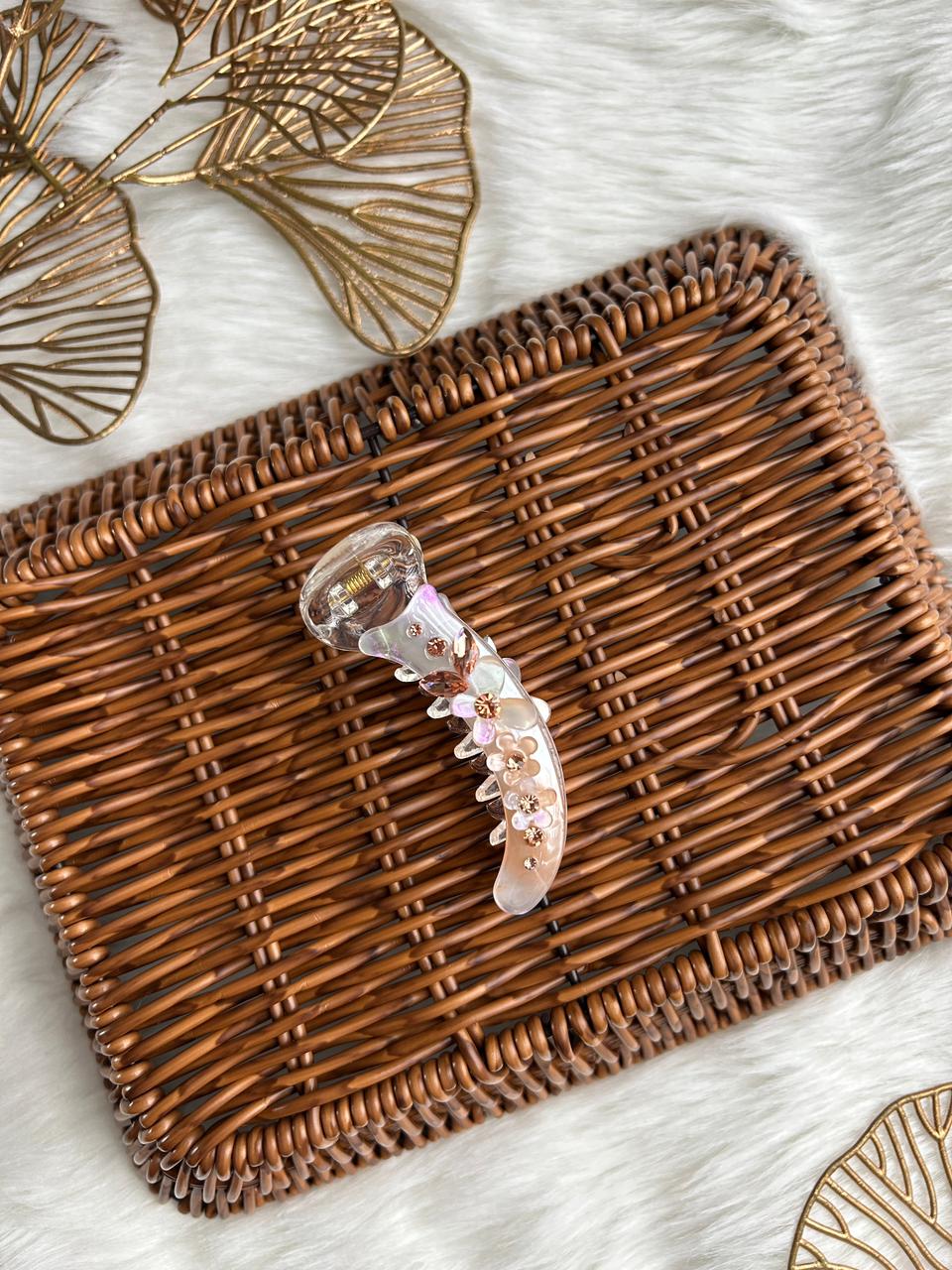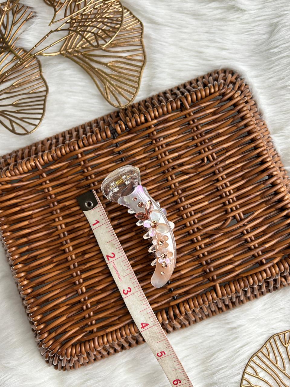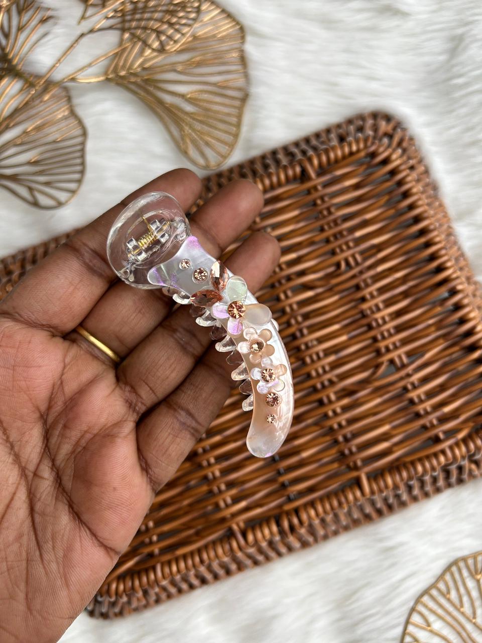 Add a touch of refined charm to your hairstyle with this elegant banana hair clip. Crafted in a soft translucent finish with subtle iridescent polka details, this clip is beautifully adorned with delicate floral accents and crystal centers for a graceful, feminine look.