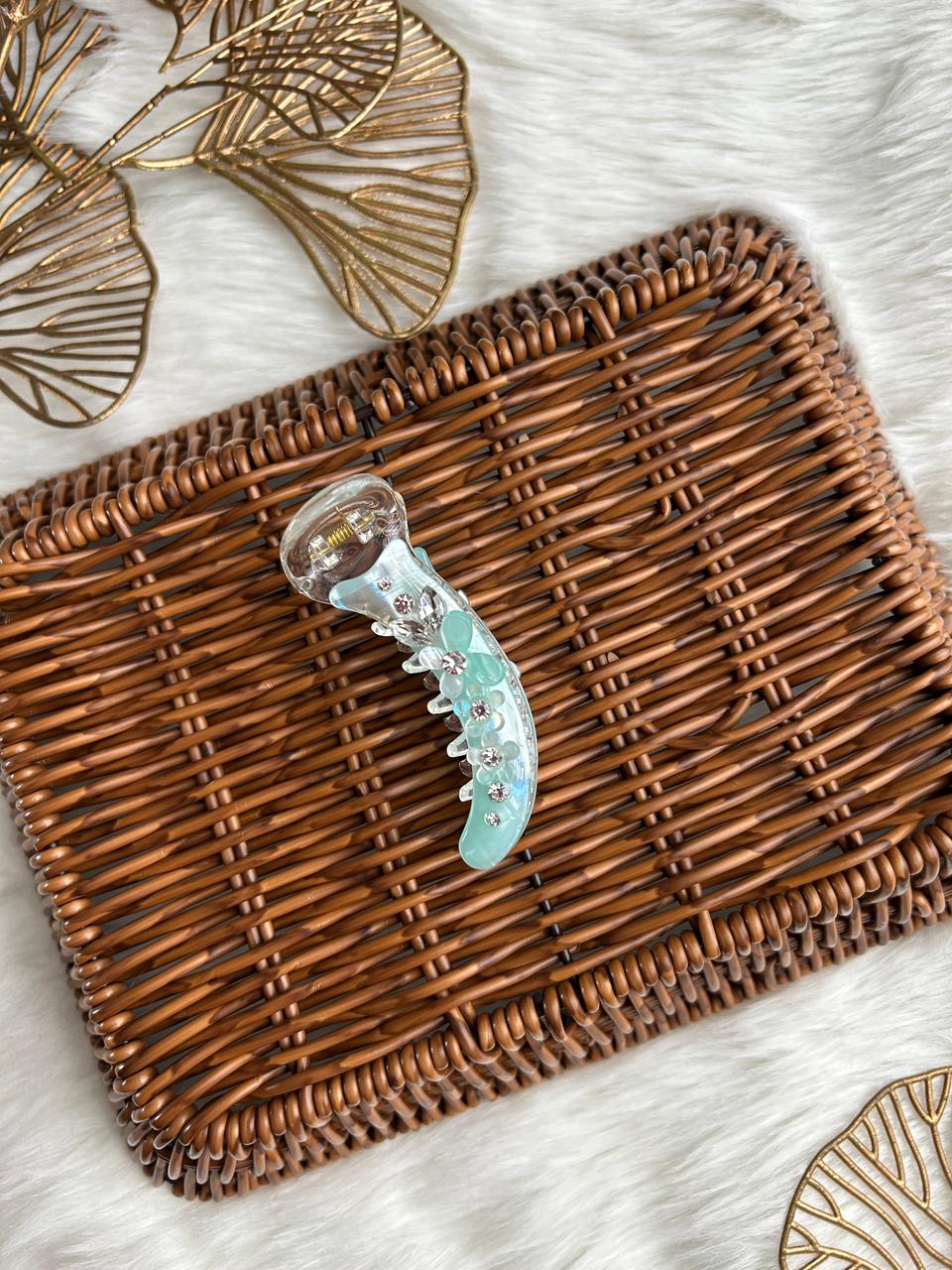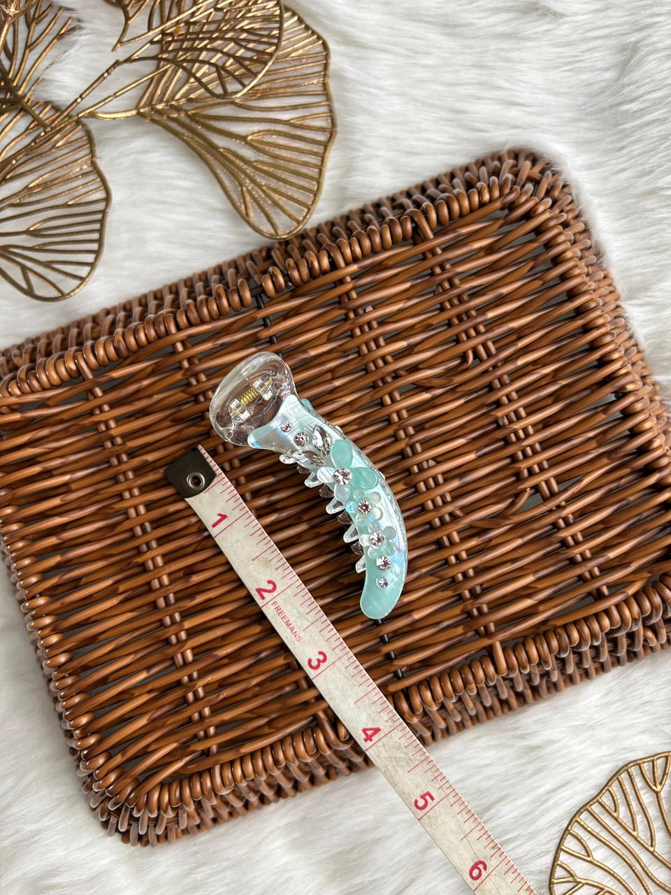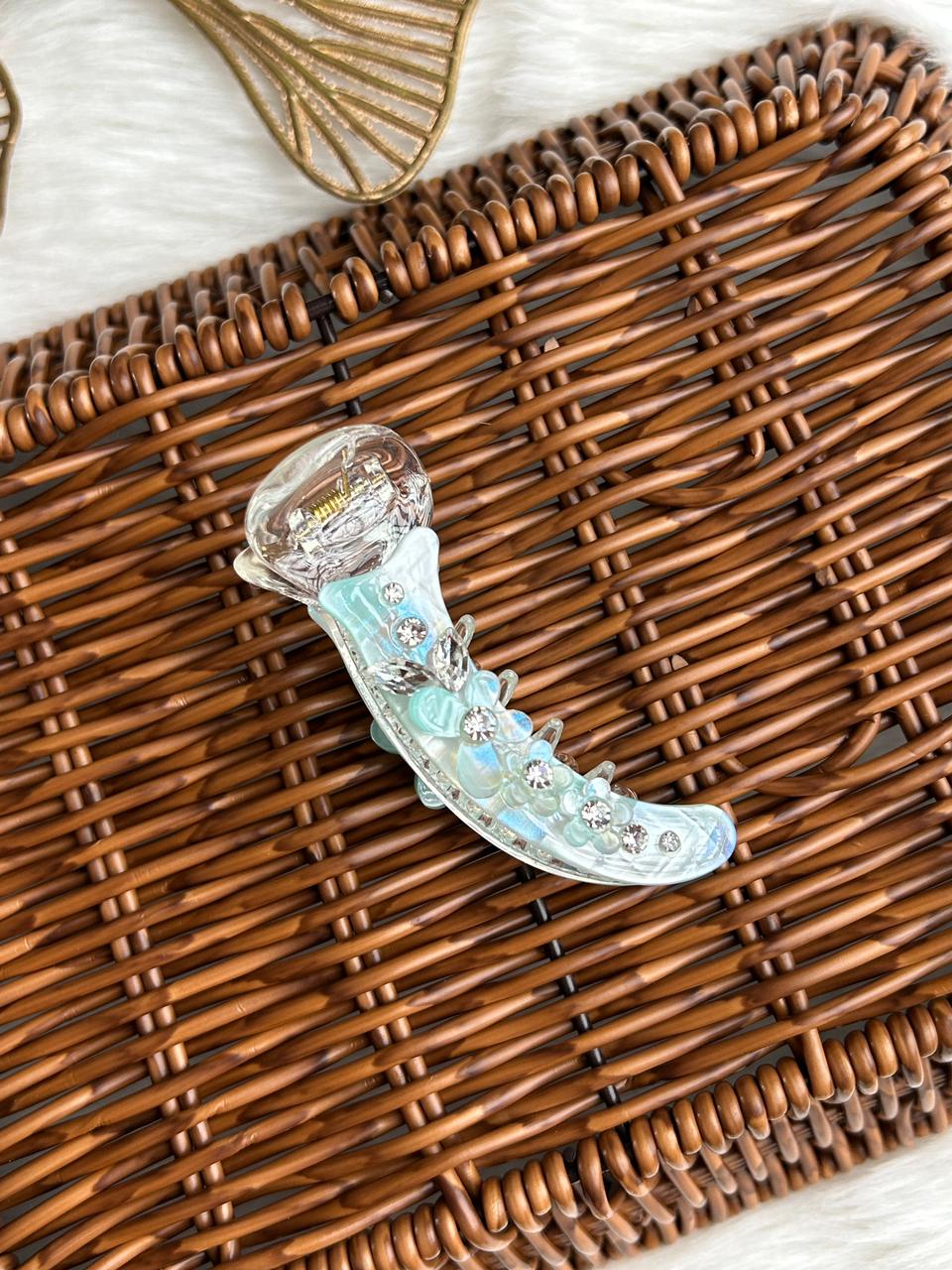 Add a touch of refined charm to your hairstyle with this elegant banana hair clip. Crafted in a soft translucent finish with subtle iridescent polka details, this clip is beautifully adorned with delicate floral accents and crystal centers for a graceful, feminine look.