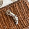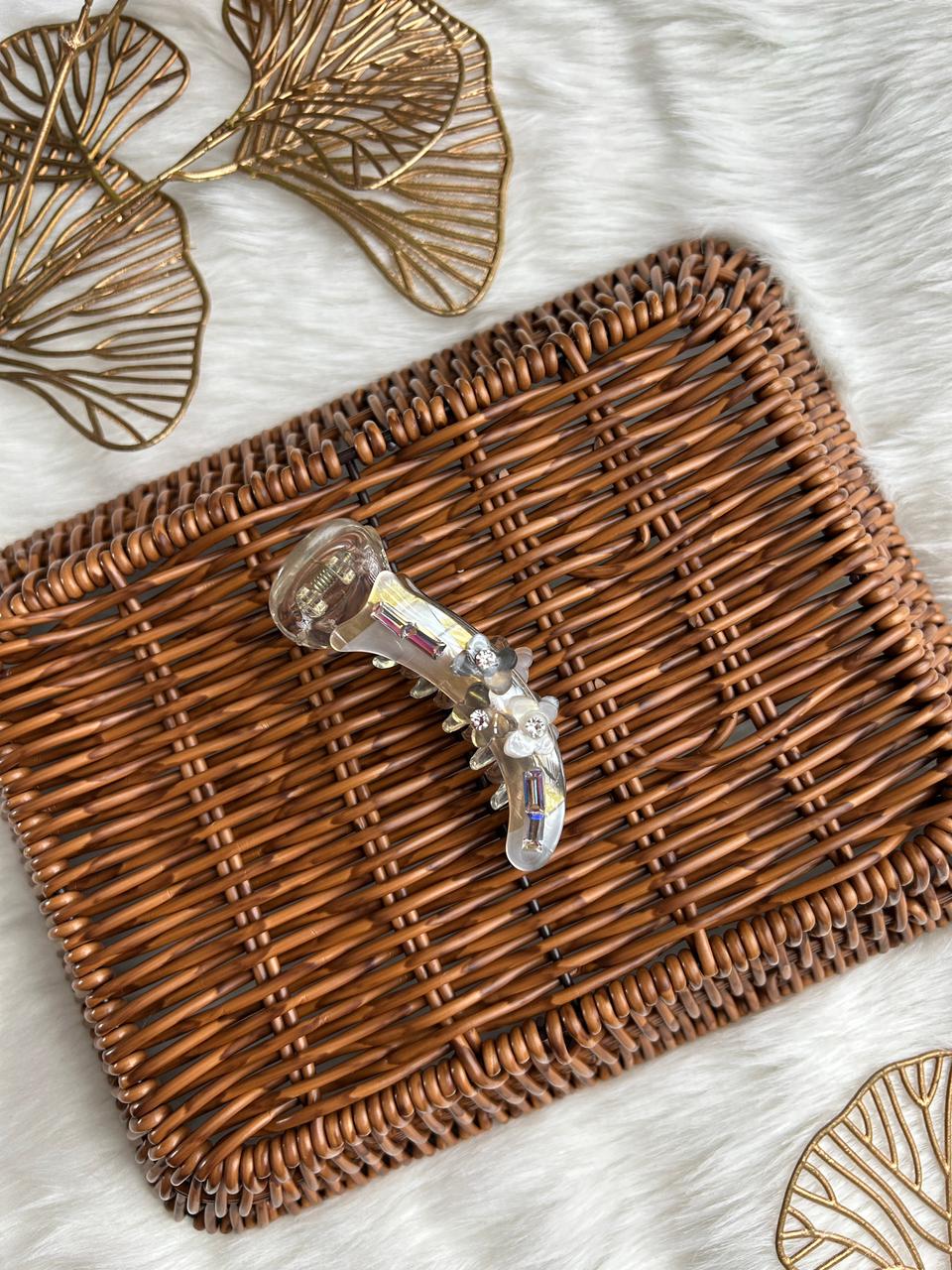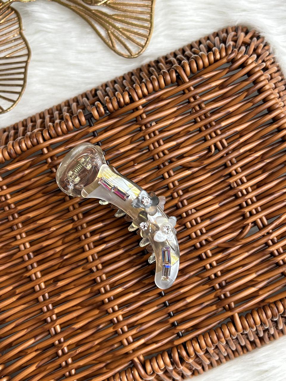 Add a touch of refined charm to your hairstyle with this elegant banana hair clip. Crafted in a soft translucent finish with subtle iridescent polka details, this clip is beautifully adorned with delicate floral accents and crystal centers for a graceful, feminine look.