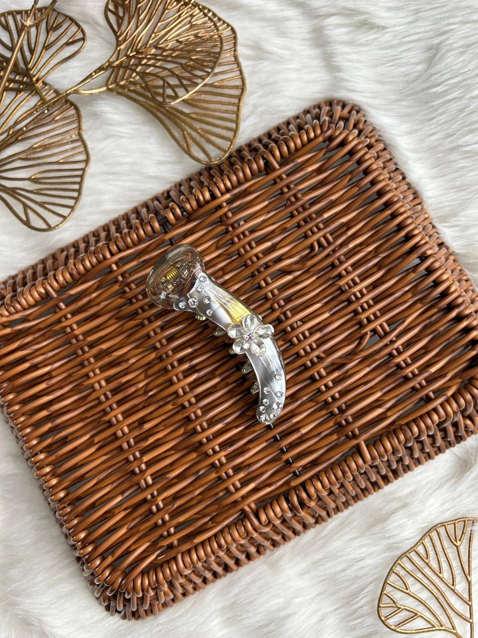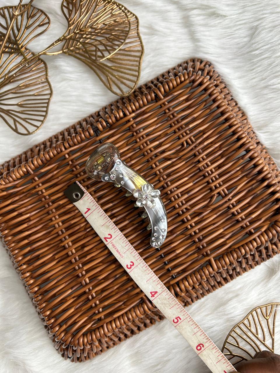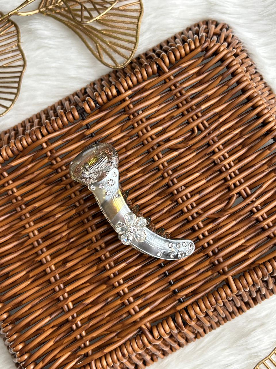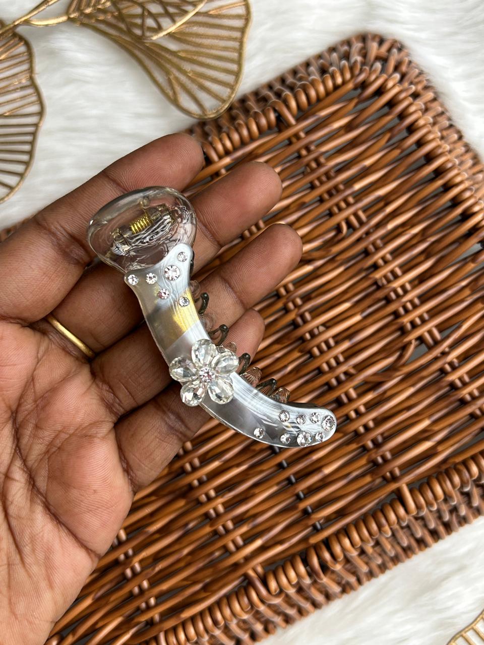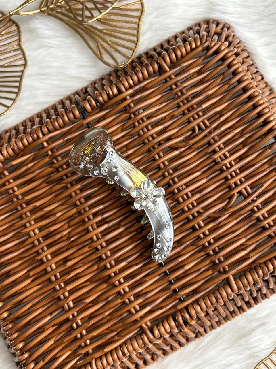 Add a touch of refined charm to your hairstyle with this elegant banana hair clip. Crafted in a soft translucent finish with subtle iridescent polka details, this clip is beautifully adorned with delicate floral accents and crystal centers for a graceful, feminine look.