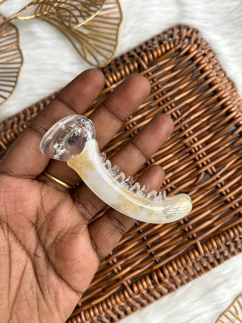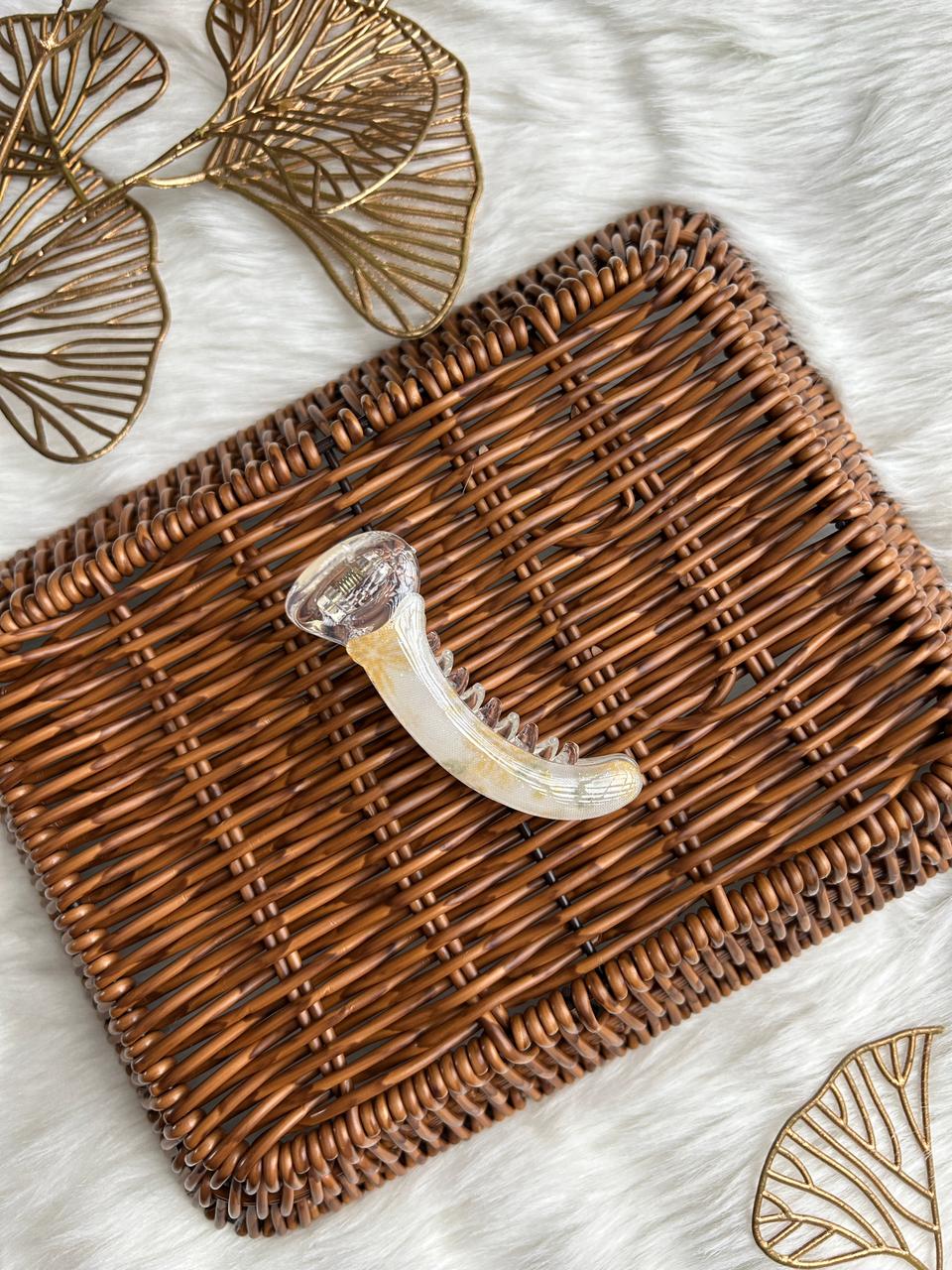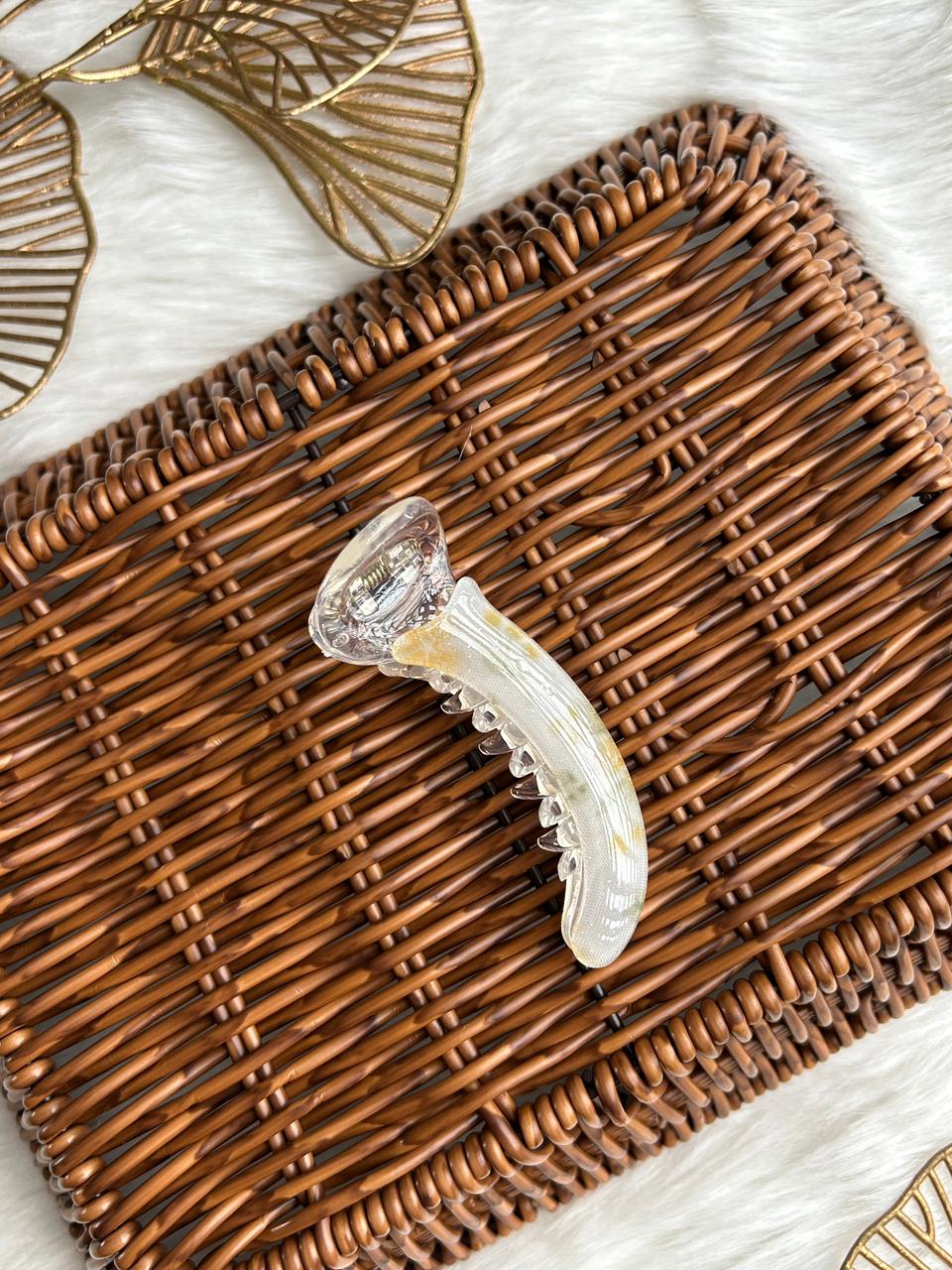 :Grace your hair with subtle luxury using this translucent banana hair clip. Designed with a soft pearl-clear finish and delicate blush accents, it offers a refined, feminine charm. Lightweight yet secure, it’s perfect for effortless everyday elegance and polished styling.