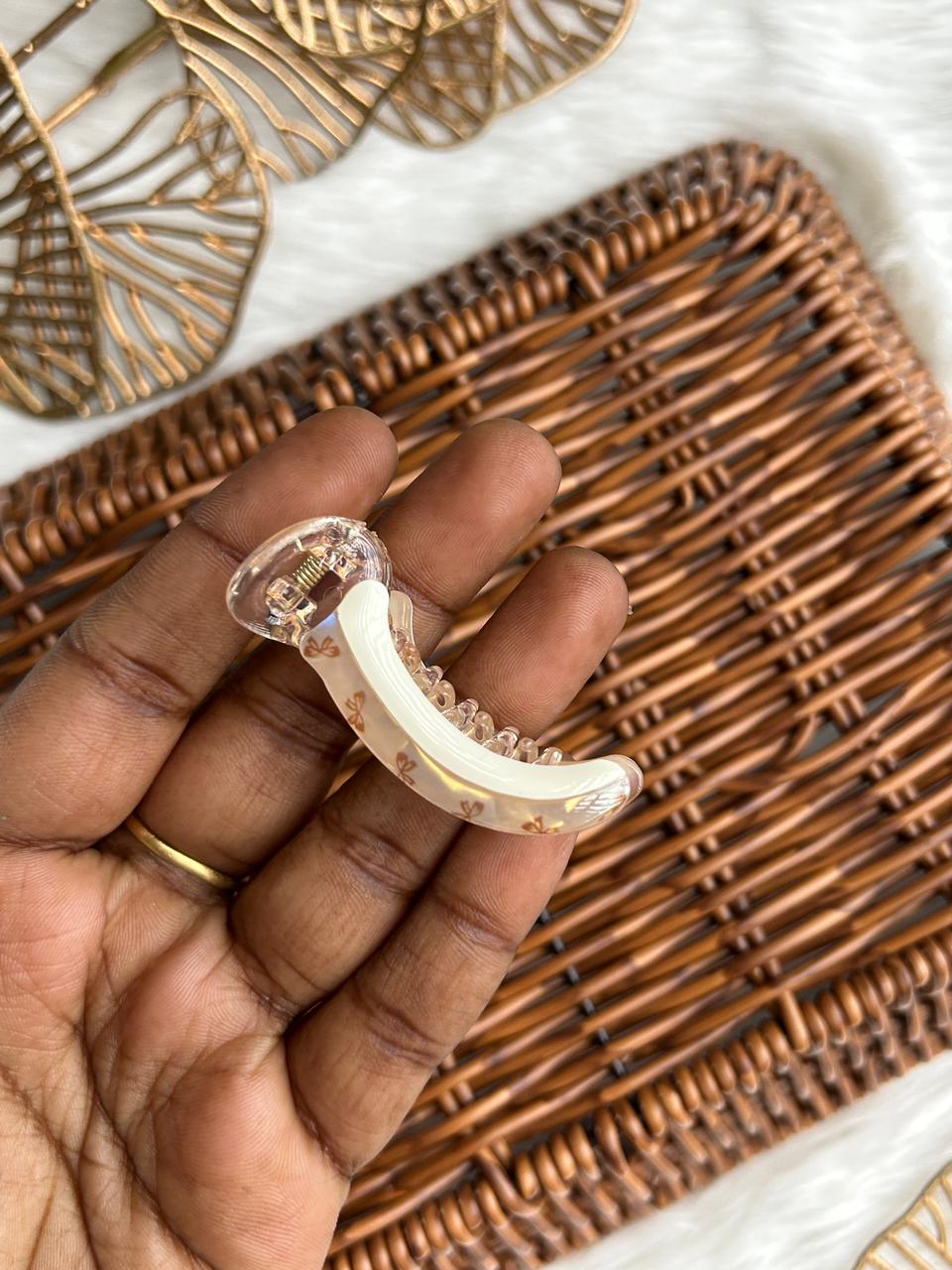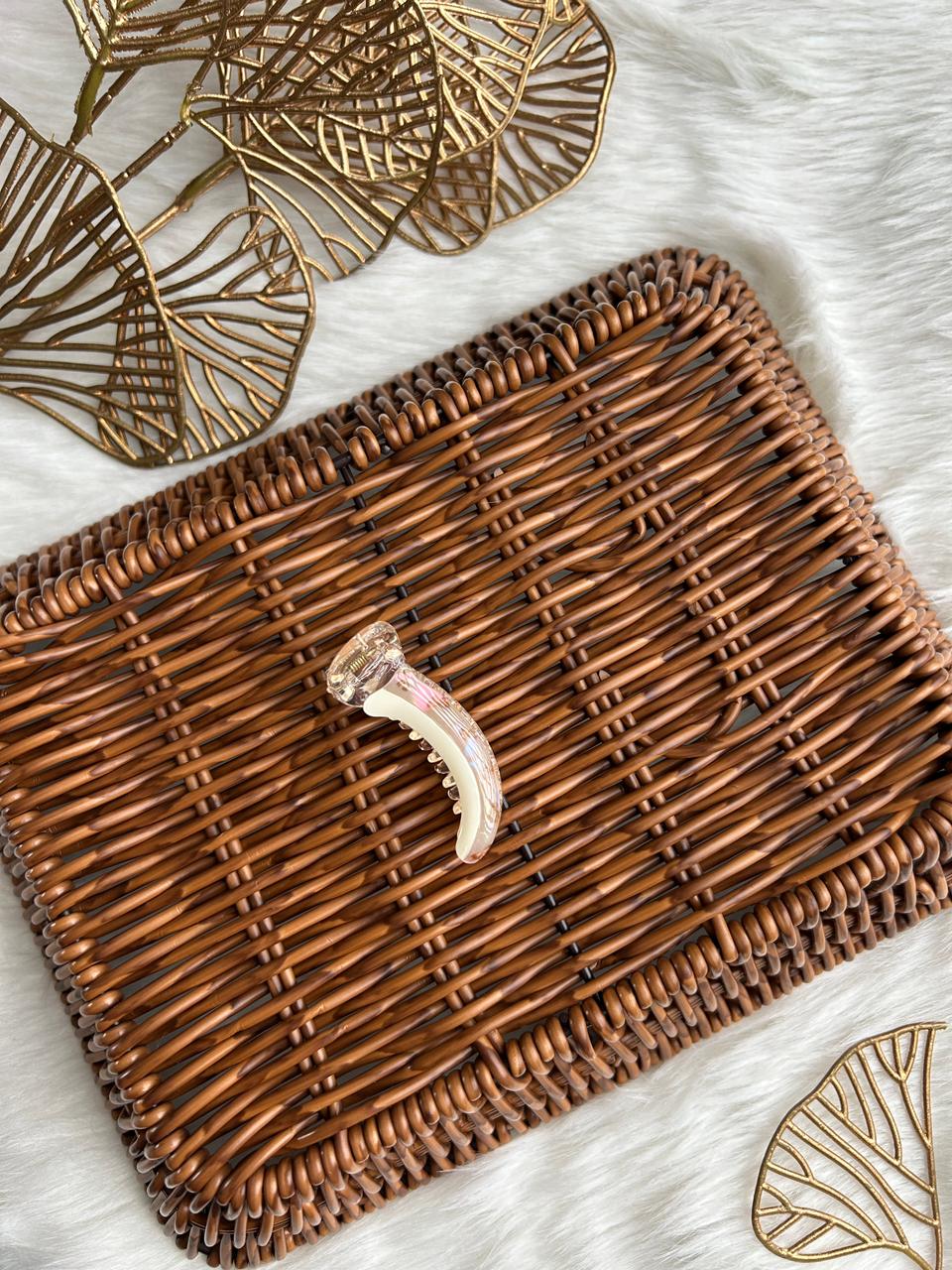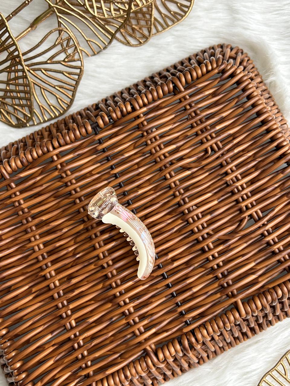 :Grace your hair with subtle luxury using this translucent banana hair clip. Designed with a soft pearl-clear finish and delicate blush accents, it offers a refined, feminine charm. Lightweight yet secure, it’s perfect for effortless everyday elegance and polished styling.