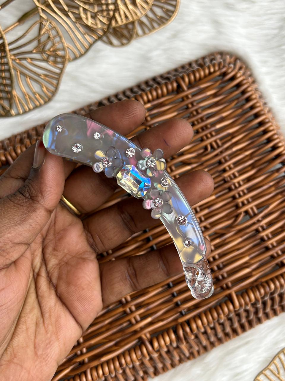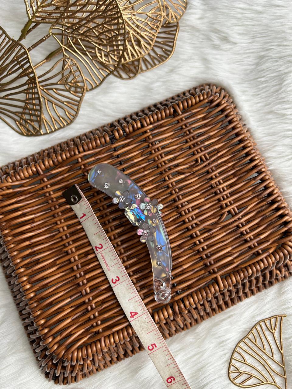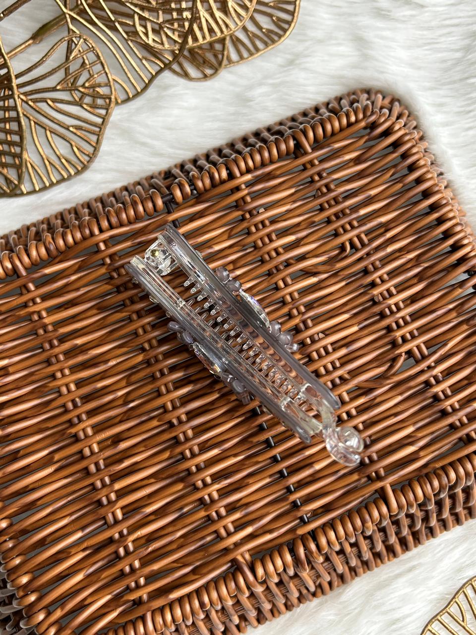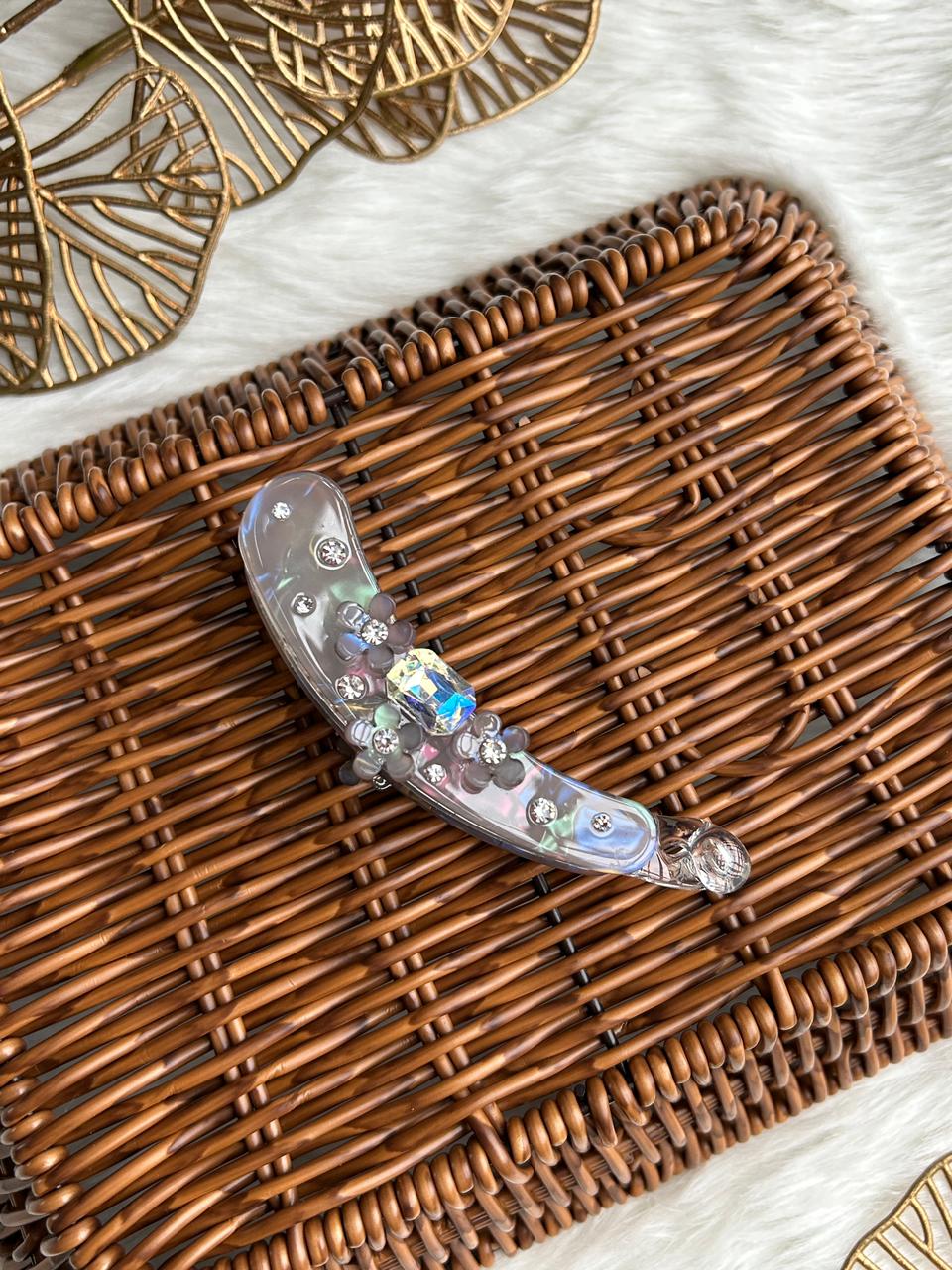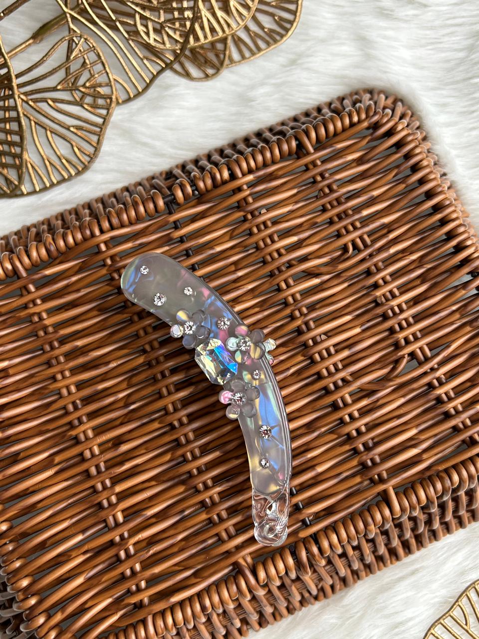 Elegant and classy lock clip crafted with a transparent pearl-finish base, beautifully adorned with soft crystal stones and delicate floral accents. The central crystal adds a subtle sparkle, giving it a premium and graceful look. Designed with a sturdy locking mechanism, it holds hair securely without pulling or slipping.