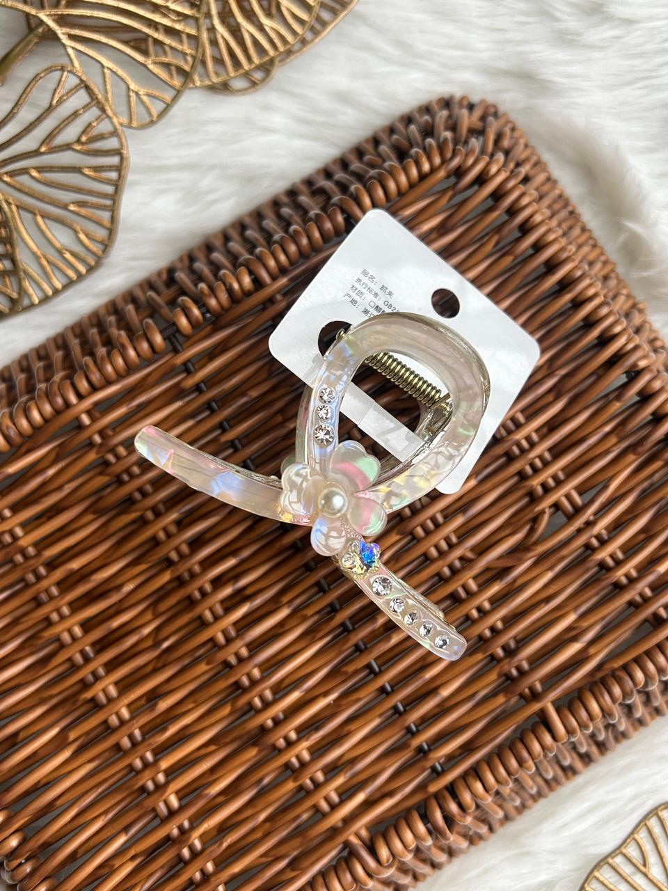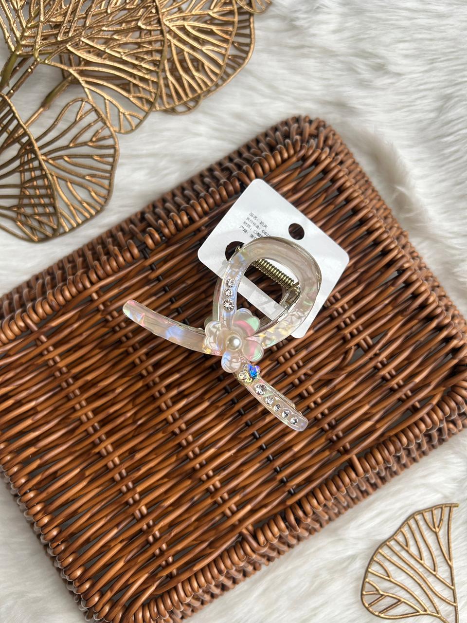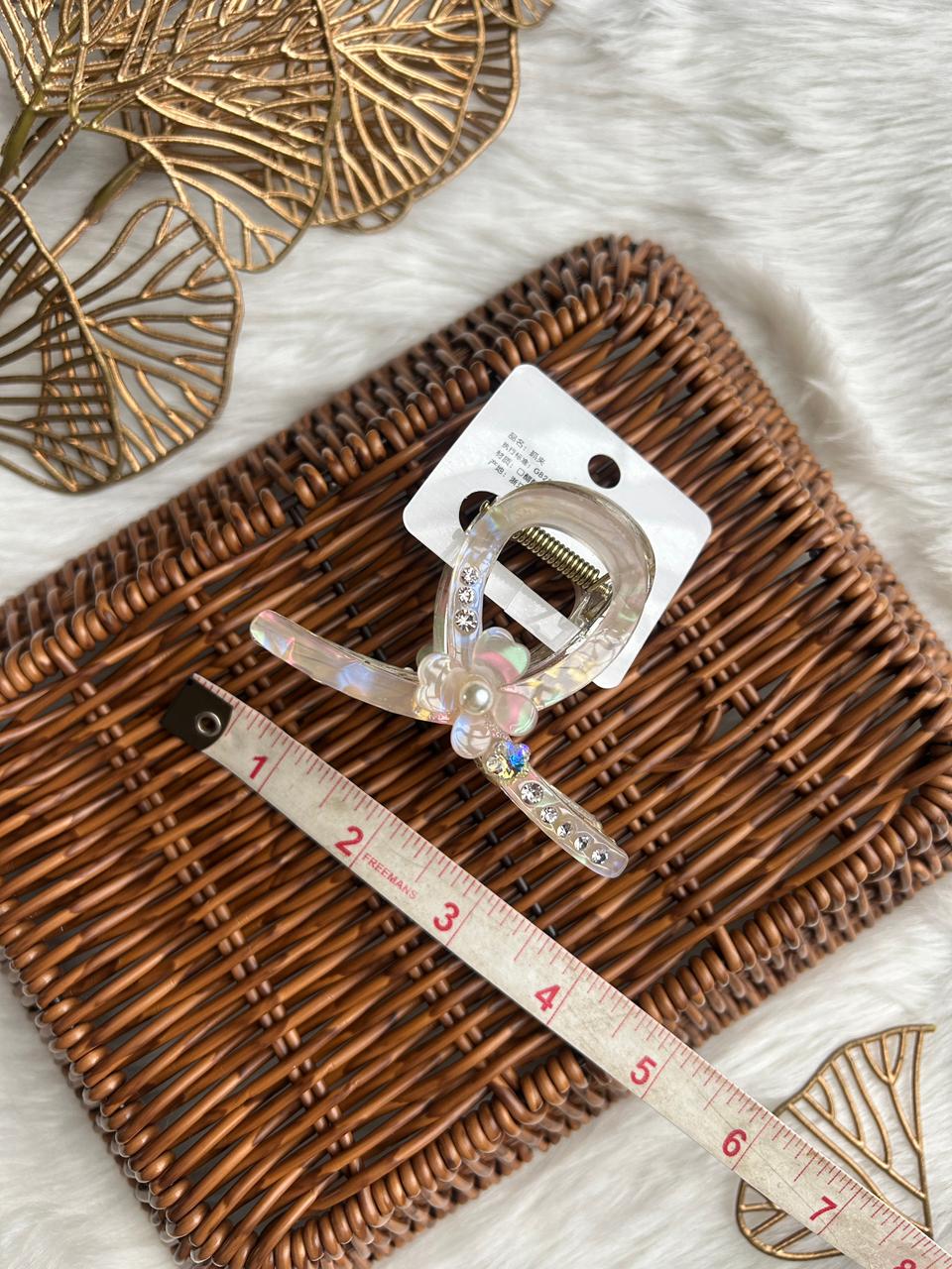 Add a touch of charm to your hairstyle with this elegant translucent Colourful hair clip. Crafted from high-quality acrylic, it features a modern curved design accented with sparkling rhinestones, a delicate pearl detail, and a subtle butterfly charm for a feminine finish. The sturdy metal spring ensures a secure grip, making it perfect for holding hair comfortably throughout the day. Ideal for casual wear, parties, or special occasions, this stylish clip effortlessly blends functionality with elegance.