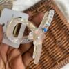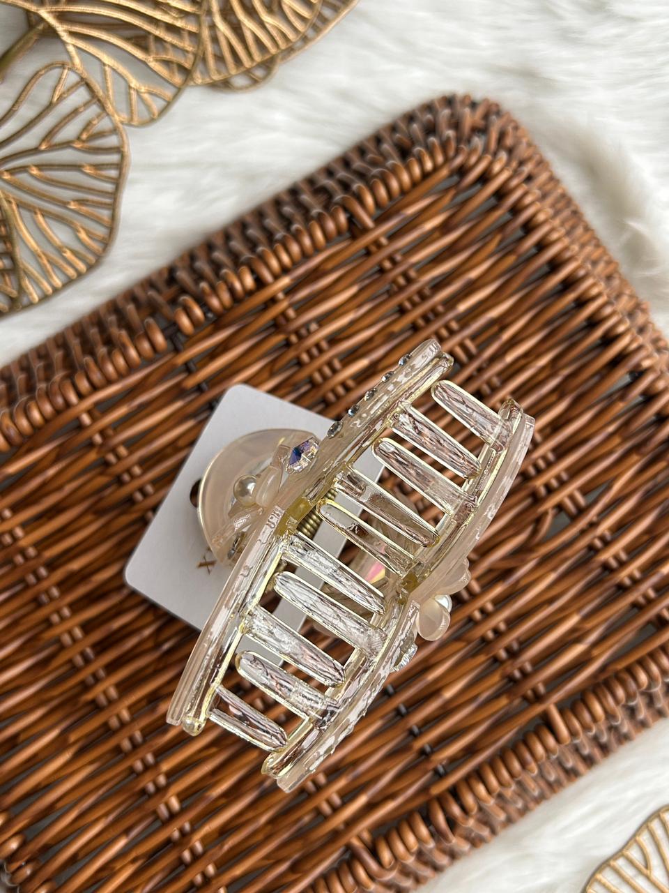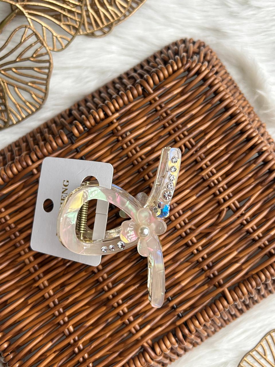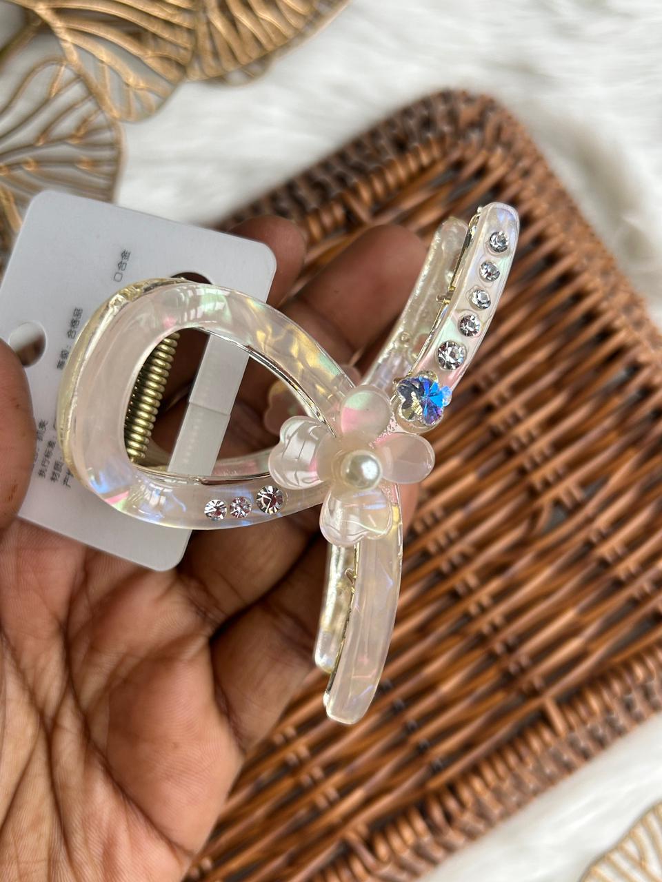 Add a touch of charm to your hairstyle with this elegant translucent Colourful hair clip. Crafted from high-quality acrylic, it features a modern curved design accented with sparkling rhinestones, a delicate pearl detail, and a subtle butterfly charm for a feminine finish. The sturdy metal spring ensures a secure grip, making it perfect for holding hair comfortably throughout the day. Ideal for casual wear, parties, or special occasions, this stylish clip effortlessly blends functionality with elegance.