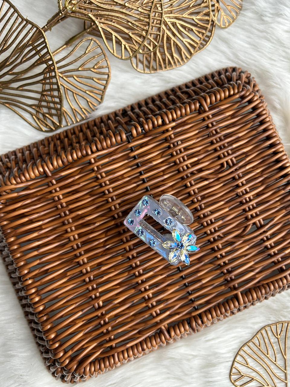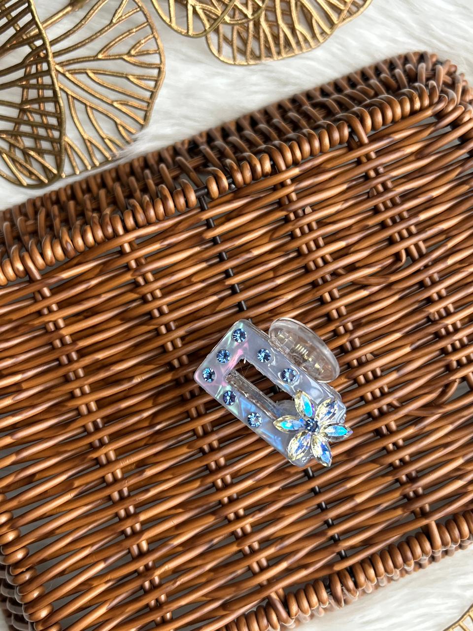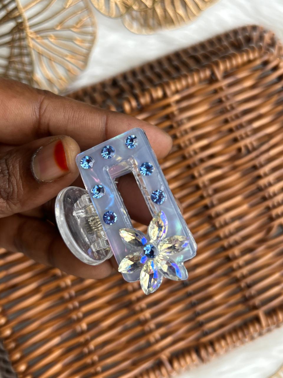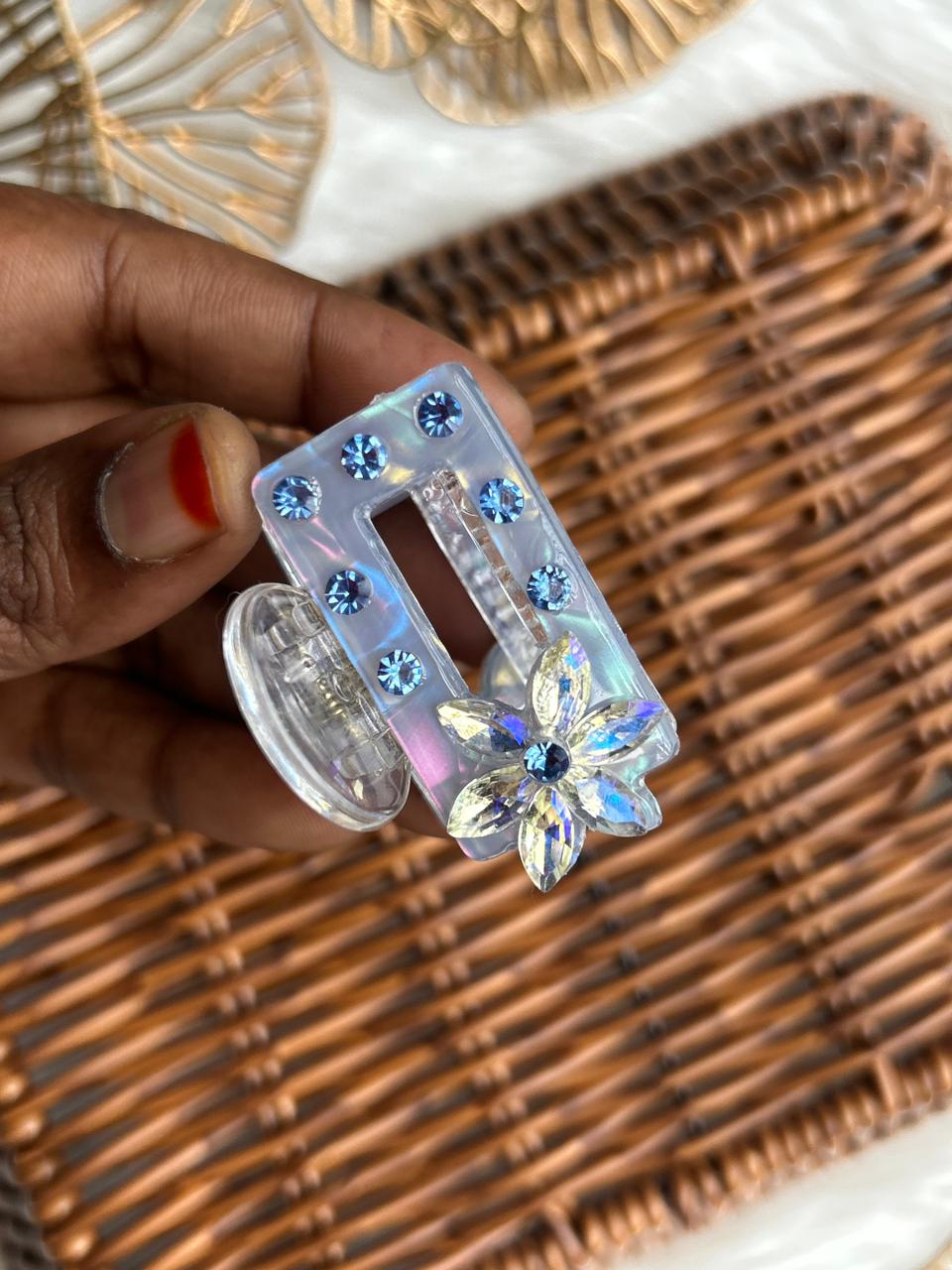 Add instant sparkle to your hairstyle with this elegant iridescent hair clip. Crafted from premium transparent acrylic, it features a sleek geometric design embellished with shimmering rhinestones and a stunning crystal flower accent that reflects light beautifully. The strong spring mechanism ensures a secure, comfortable hold, making it ideal for everyday wear as well as festive and party occasions. A perfect blend of modern style and feminine charm, this hair clip elevates any look effortlessly.