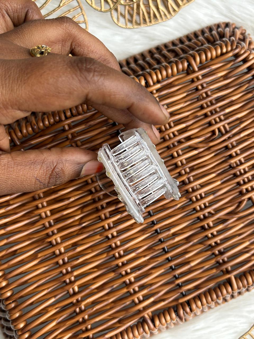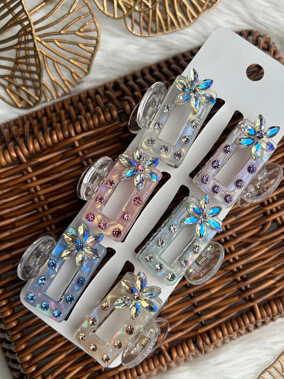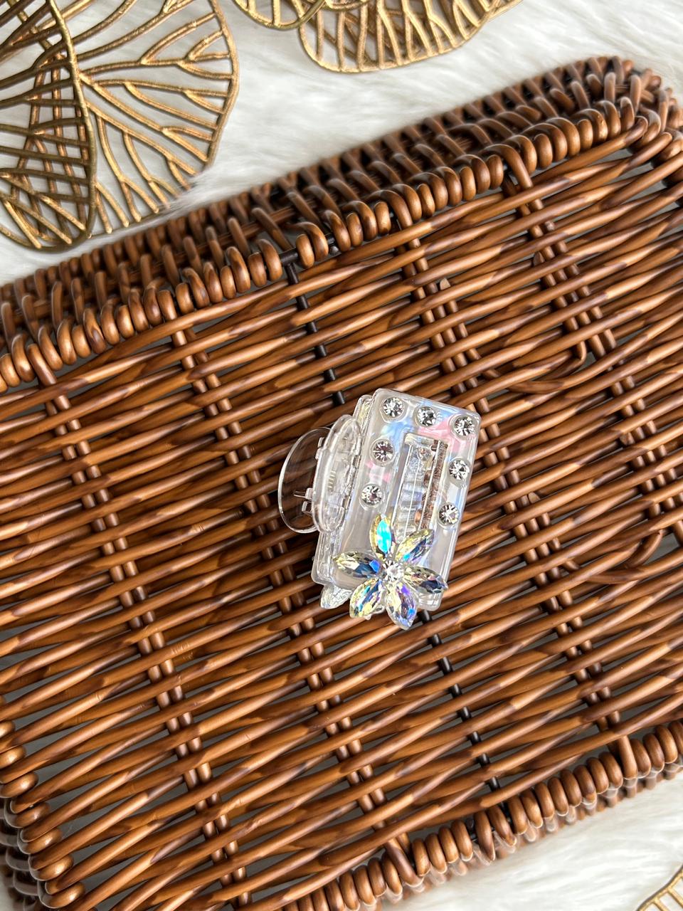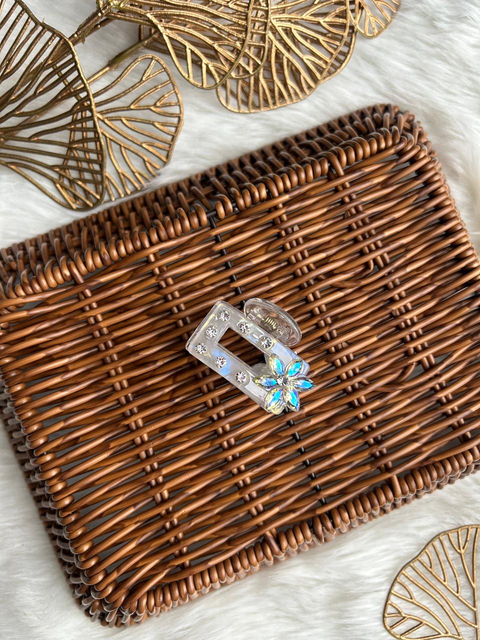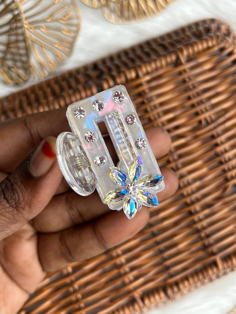 Add instant sparkle to your hairstyle with this elegant iridescent hair clip. Crafted from premium transparent acrylic, it features a sleek geometric design embellished with shimmering rhinestones and a stunning crystal flower accent that reflects light beautifully. The strong spring mechanism ensures a secure, comfortable hold, making it ideal for everyday wear as well as festive and party occasions. A perfect blend of modern style and feminine charm, this hair clip elevates any look effortlessly.