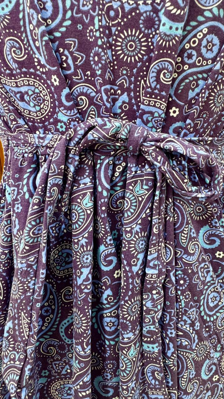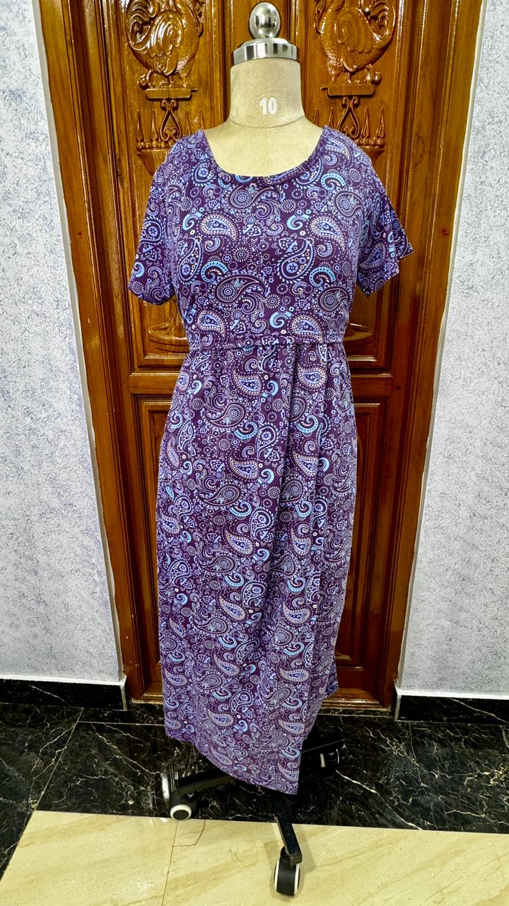 80% Cotton feel 20% Elastane, summer friendly,little weight , stretchable, Half Sleeve, Maxi length, One side packet, adjustable knot at back.
