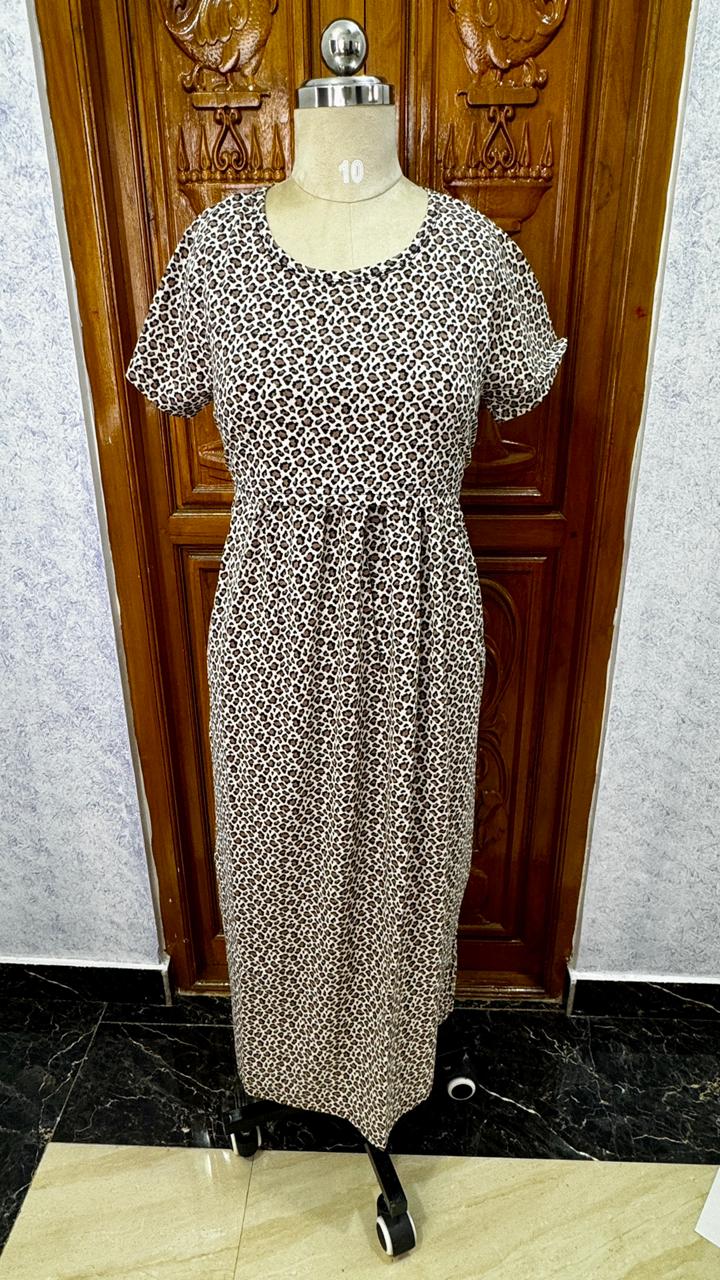 80% Cotton feel 20% Elastane, summer friendly,little weight , stretchable, Half Sleeve, Maxi length, One side packet, adjustable knot at back.