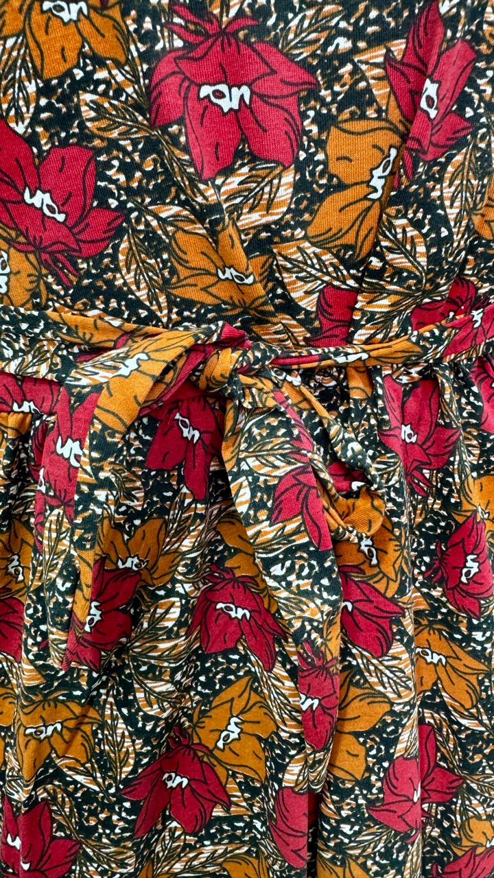 80% Cotton feel 20% Elastane, summer friendly,little weight , stretchable, MIDI length, One side packet, adjustable knot at back.